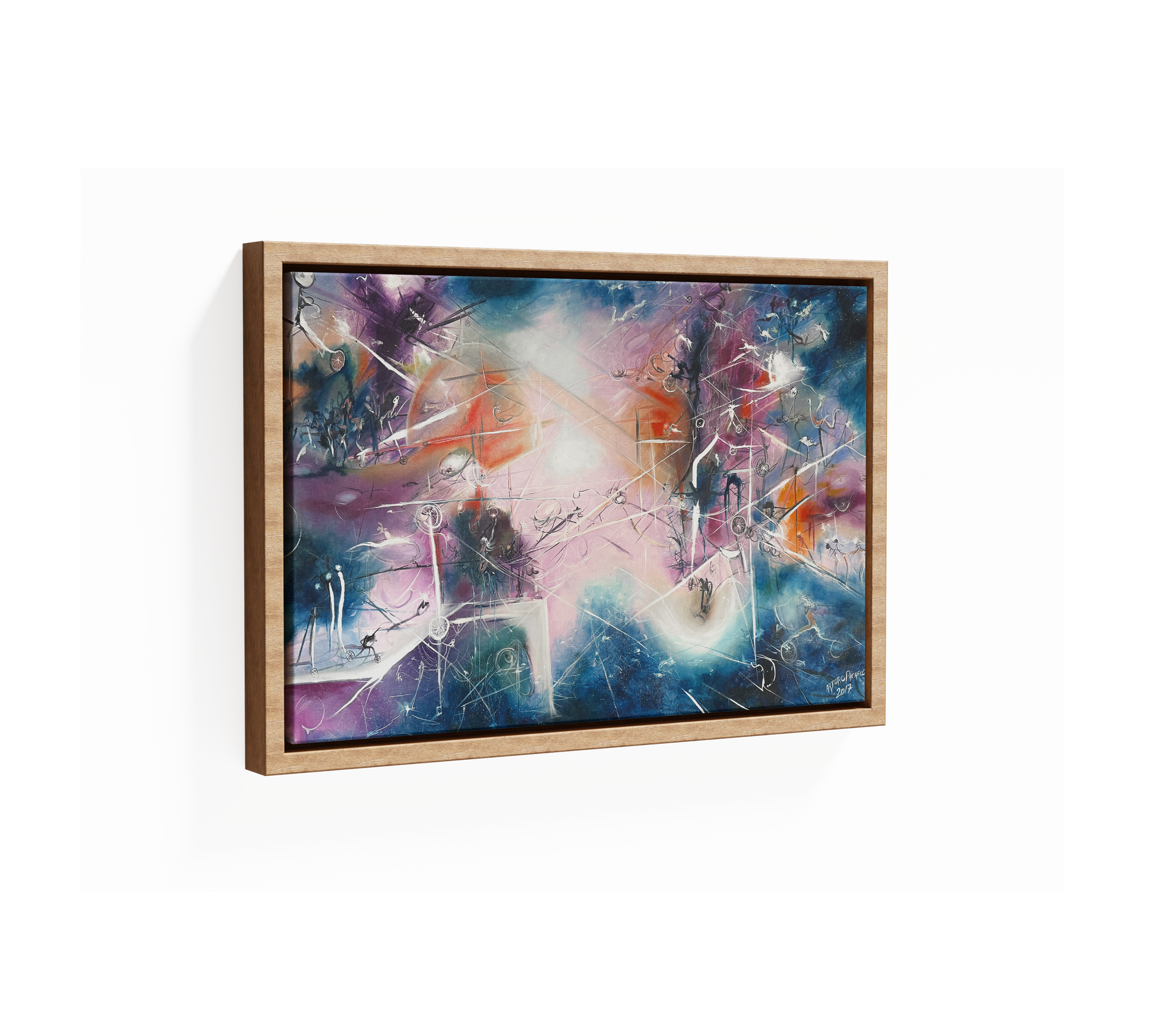 Galaxia es una obra abstracta que invita a viajar más allá de lo visible. Con una explosión de tonos azules, púrpuras y destellos luminosos, Arturo Pacheco nos transporta a un universo etéreo donde la luz se convierte en protagonista.