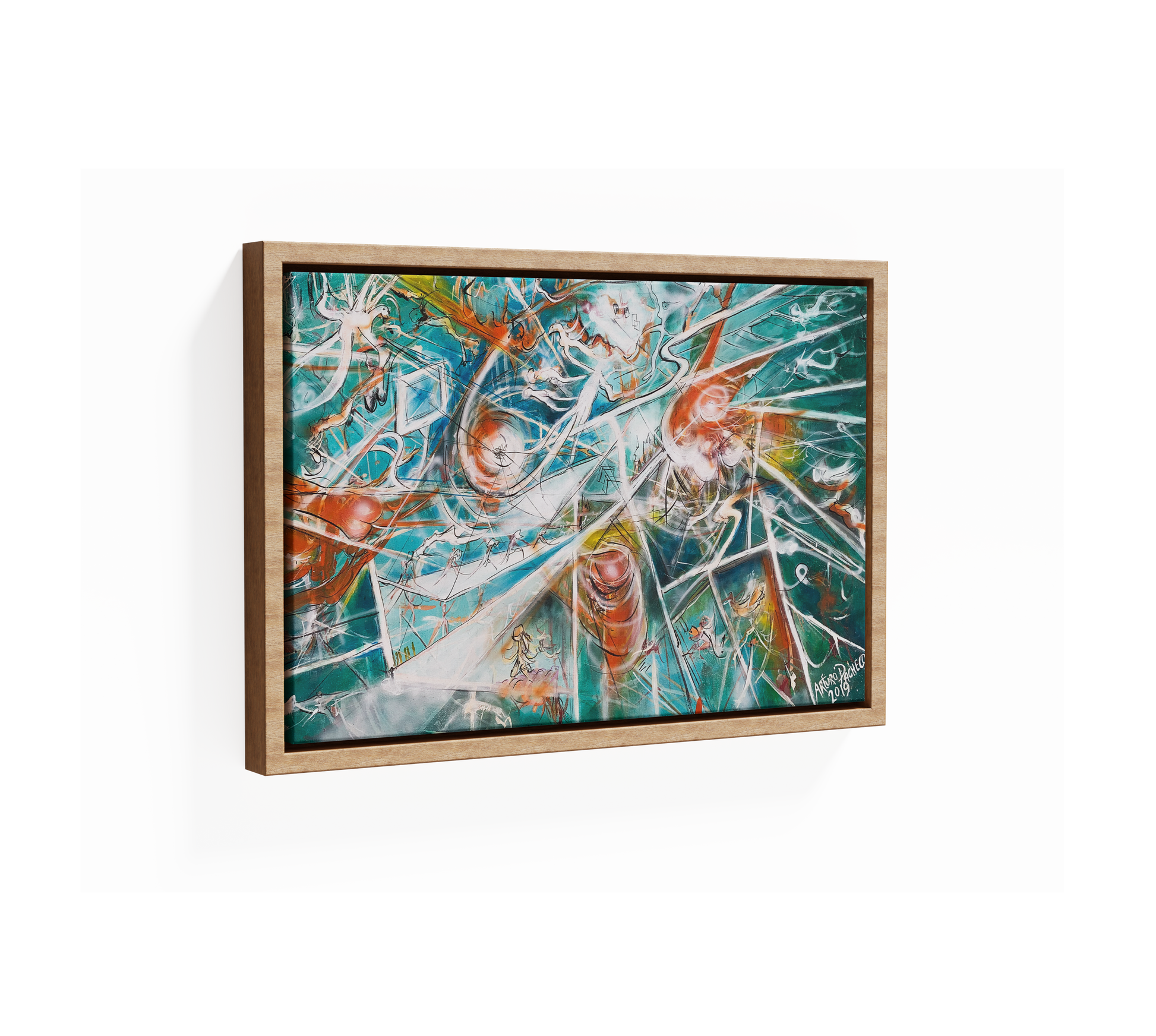 Impresa en canvas de alta calidad, esta reproducción conserva la intensidad y la vivacidad de la pieza original, resaltando sus matices y capas. Tonos de azul y verde turquesa se entrelazan con acentos de naranja y rojo terracota, mientras líneas blancas y precisas recorren la composición, sugiriendo caminos, conexiones y relatos ocultos. Entre las formas abstractas parecen asomar figuras o rostros velados, invitando al espectador a descubrir sus propias interpretaciones.